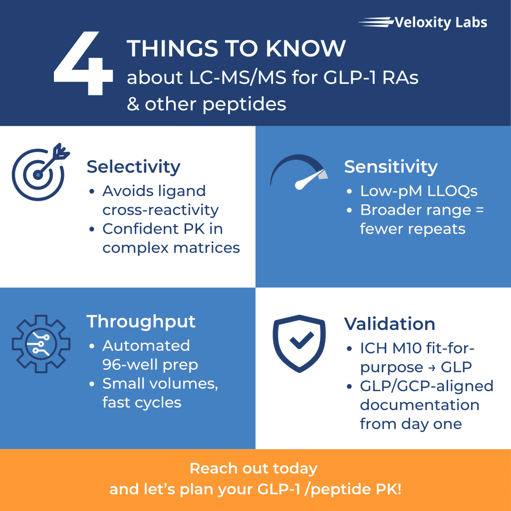 Veloxity builds peptide-savvy methods that anticipate the next phase, supporting a smooth transition from fit-for-purpose → GLP → clinical.