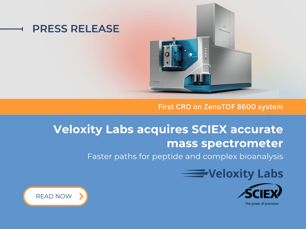Veloxity Labs has acquired the SCIEX ZenoTOF 8600 system, becoming the first bioanalytical CRO to bring this accurate-mass system online. The 8600 adds HRAM selectivity/sensitivity and expanded mass range for intact peptides/proteins—speeding method cycles for GLP-1 RAs and broader peptide programs while complementing our triple-quads. Delivery is expected this year; install/qualification begins January 2026.